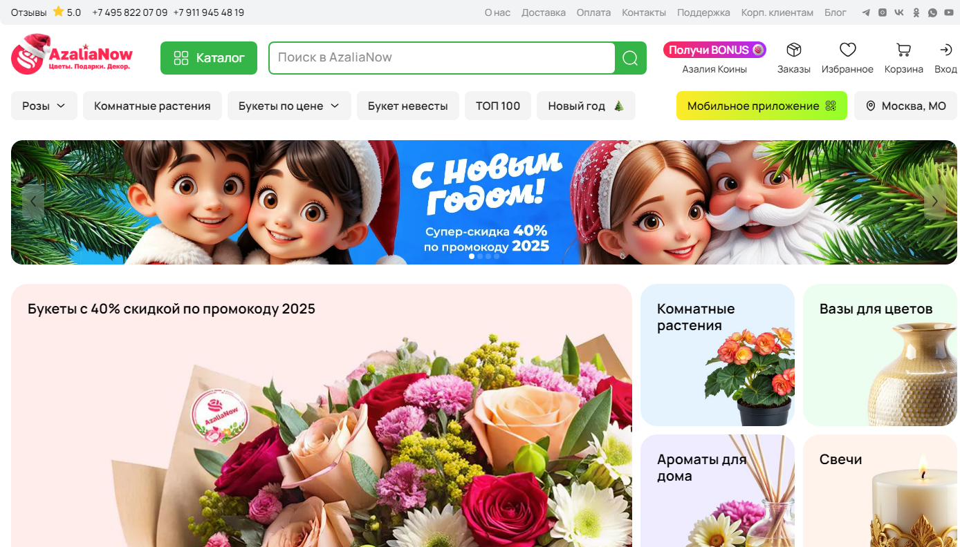 Основные товары: Гипермаркет AzaliaNow — это современный интернет-магазин, который специализируется на цветах, подарках и декоре. Он предлагает широкий ассортимент свежих цветов, стильных подарков и оригинальных украшений для любого события. Благодаря удобному интерфейсу и интуитивно понятной навигации, покупатели могут легко выбрать и заказать необходимые товары. Доставка осуществляется по Москве и Московской области, что делает процесс выбора и получения подарков максимально комфортным. AzaliaNow стремится создавать уют и радость в жизни своих клиентов, предлагая только качественные и уникальные товары.